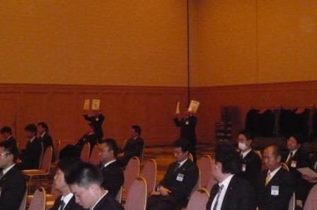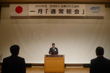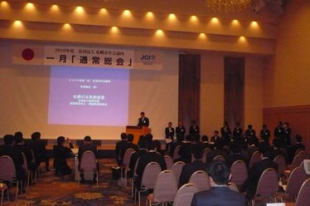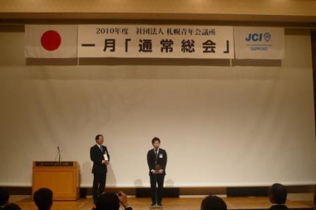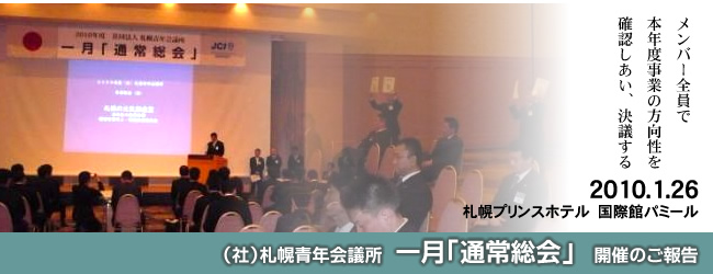 1月26日(火)札幌プリンスホテル 国際館パミールにて2010年度「通常総会」が開催されました。総会は、(社)札幌青年会議所の最高議決機関であり、すべてのメンバーが等しく一票の議決権を行使する機会であります。本総会にて2009年度事業報告・収支決算、2010年度予算案や事業計画などについて、慎重かつ迅速な審議が執り行われ、全ての議案について可決承認されましたことをご報告させていただきます。また佐々木和宏直前理事長、スローガン発案者である広報渉外委員会 奥山倫行副委員長、シンボルマーク発案者である子どもの心育成委員会 堀田真理副委員長の3名に、感謝状・記念品の贈呈が行われました。