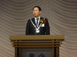OB会杉本 亙会長から祝辞をいただき、21名のOB予定者の卒業式が行われ、玉腰理事長から北嶋理事長予定者へプレジデンシャルリースと理事長バッジが継承されました。