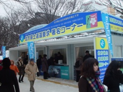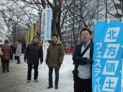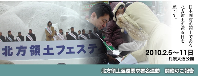 2月7日(日)札幌市中央区大通西4丁目さっぽろ雪まつり会場ステージにて「2010北方領土フェスティバル」が開催され、時折雪が降る中、元島民の訴え、北方領土早期返還に向けた決意表明などの式典に多くの来場者が訪れており、私たち(社)札幌青年会議所メンバーも参加をいたしました。また、大通西6丁目会場に設置された「北方領土返還要求署名コーナー」において、2月5日(金)〜11日(木)の雪まつり期間中、署名運動のご協力をさせていただいたほか、2月7日(日)にはJR札幌駅前交差点やすすきの交差点において街頭署名運動を行いました。