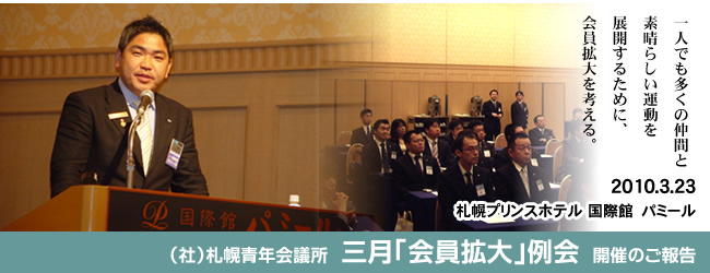 3月23日(火)札幌プリンスホテル 国際館パミールにおきまして、2010年度(社)札幌青年会議所 三月「会員拡大」例会 〜さあ、変革の時 ここから始まる意識改革〜が開催されました。 会員拡大は青年会議所の組織を存続、活性化するために不可欠な最重要事項であり、LOM一丸となって取り組んでいくことを、メンバー一人ひとりが重要性を再確認し実践していただく起点とさせていただきました。