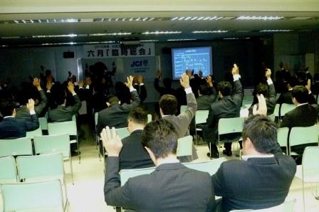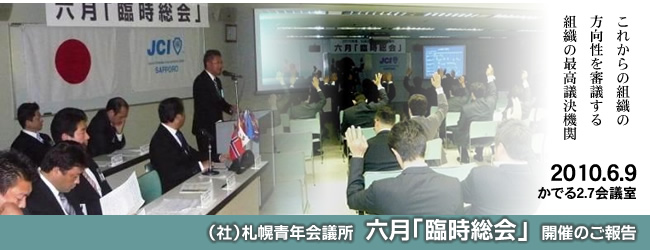 6月9日(水)18:30より、北海道立道民活動センター(かでる2・7)にて、六月「臨時総会」が開催されました。(社)札幌青年会議所の最高議決機関である本総会において、現役メンバー一人ひとりが議決権を行使し、2010年度例会計画の日程に関する変更や第24回国際アカデミー誘致立候補などについて、慎重かつ迅速な審議が執り行われました。全ての議案について、賛成多数をもって可決承認されましたことをご報告させていただきます。国際アカデミー誘致に関しては、今後3年間継続して立候補することも含め審議されました。
