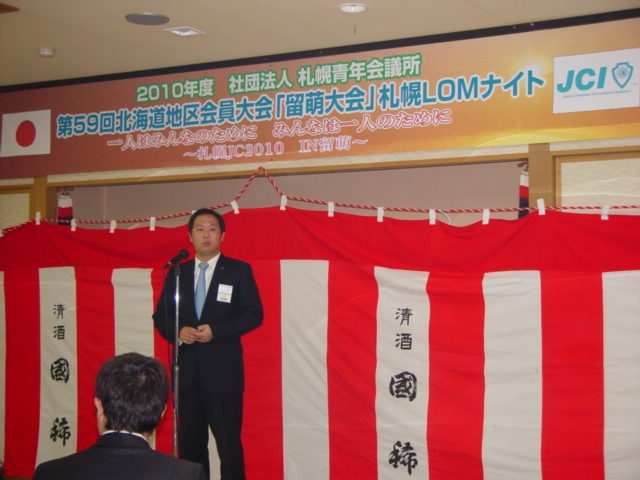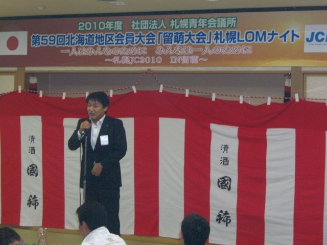 2010年9月10日(金)〜12日(日)の3日間「燃やせ やん衆魂!」〜発想の転換で切り拓け!人の進歩が導く輝く大地「たから島 北海道」〜をテーマに第59回北海道地区会員大会「留萌大会」が留萌市内各所にて行なわれました。11日(土)には光風館石亭にて札幌LOMナイトを開催し、北海道地区協議会に出向されたメンバーの一年間の功労を称え、本年卒業のメンバーを囲みながら語らい、多くの現役メンバーで卒業をお祝いしました。