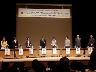 4月23日(火)、札幌市教育文化会館小ホールにて四月特別事業が開催されました。札幌市は近い将来、少子高齢化の進展にともない総人口と生産年齢人口が急速に減少するという見通しから消費者・労働力人口の減少が発生、それが経済規模の縮小へとつながるのではという懸念が抱かれています。このような背景を踏まえ、当会議所は、6名のパネリストをお招きして、社会的にも経済的にも大きな損失と考えられる女性の就業率の低迷に着目し、これからの企業の進むべき方向を見出すための討論会を実施いたしました。当日はオープン例会ということもあり多くの一般市民の方々にもご参加いただきました。企業の女性進出が進んできているとはいえ、まだまだ課題は山積みであるということを改めて認識するとともに、意識変革を促す非常に素晴らしい例会となりました。