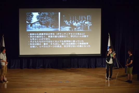 続いて、本例会の目的のひとつである「高い志」を学生自身が作り上げたプレゼンテーションにて伝えていただきました。世界で唯一の誰もが受けられる教育システムを構築した新渡戸稲造の精神を学び、未来を切り拓く原動力を参加者へ伝えていただきました。