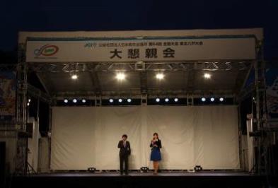 17:30より長根公園(桜木町グラウンド)にて、大懇親会が開催され、司会は地元八戸でご活躍されているアナウンサーの橋本 麗奈 氏とFMラジオでご活躍の小泉 亮 氏で行われ、開会アトラクションでは、法霊神楽「権現舞 一斉歯打ち」の披露が行われ盛り上がったところで、「全国大会記念八戸の魅力発信ユニット」による「Welcome to 八戸」(バーテダーよるパフォーマンスと音楽の融合)が行われました。