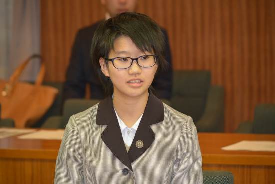 続きまして、(公社)日本青年会議所によるJCI JAPAN少年少女国連大使として、ニューヨーク国連本部などで研修した札幌聖心女子学院中学校3年 中村 理峰さんが、札幌市長 秋元 克広 氏に研修の感想と今後の意気込みを報告いたしました。