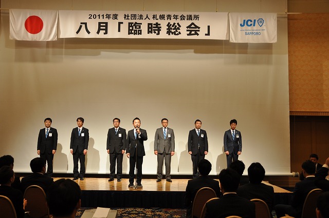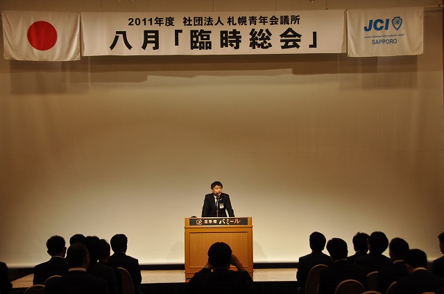 8月31日(水)札幌プリンスホテル国際館パミールにて、2011年度「臨時総会」が開催されました。青年会議所運動において総会とは、メンバー一人ひとりが議決権の行使を通じて組織の意思を決定する最高議決機関です。本総会では、厳粛な雰囲気のなか2011年度の様々な案件の審議が執り行われると共に、質疑応答に熱が入りながらも全ての議案が可決承認されました。終盤には2012年度理事長予定者である林将告君が選出され、温かい拍手を持って承認されましたことをご報告させていただきます。