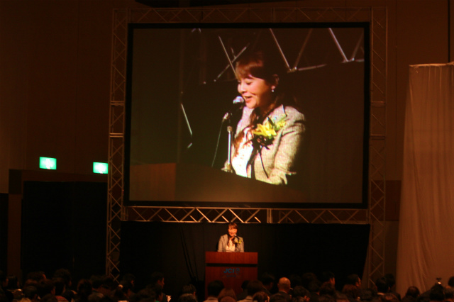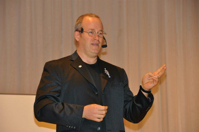 会場に一体感を与え講演するジェームス・スキナー氏 |