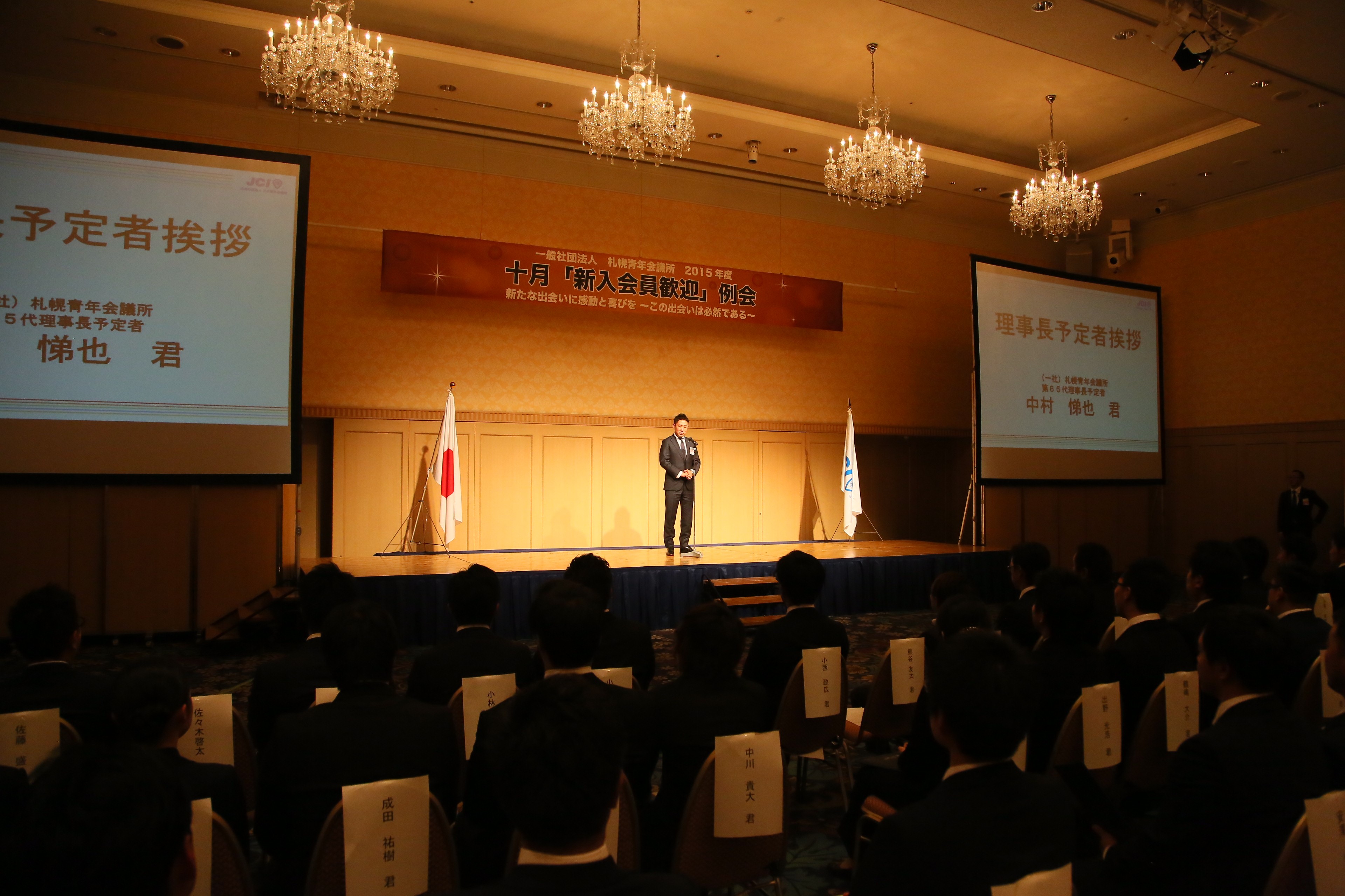 本年度理事長から新入会員予定者に祝辞をいただき、新入会員予定者に対し現役メンバーを代表し心より歓迎の意を表していただきました。また、新入会員予定者には入会した実感をもたせ、これからの青年会議所運動に対する期待を膨らませていただくと同時に、様々な経緯で入会を決められたであろう新入会員予定者全員に本例会に出席しているのは偶然ではなく必然であると気づいていただきました。