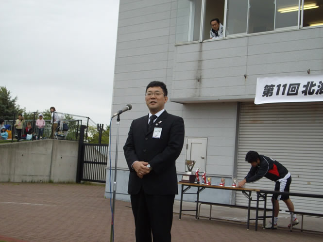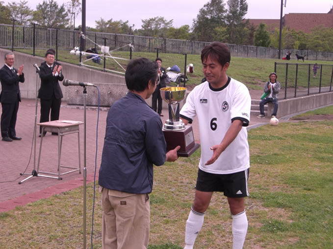 ご当地理事長挨拶として、金井英樹理事長にもお越しいただいております。さて試合ですが、予選リーグ2位通過の後、決勝トーナメントでは昨今なかなか勝てていなかった、白老JCに1対0でヴィクトリーし、そのままの勢いもあったのか、決勝戦でも予選で引き分けた恵庭JCに1対0にて勝利となり、優勝の誉れを9年ぶりに頂きました。また、MVPには本大会運営事務局長も勤めました、田中克弘サブキャプテンが選ばれております。平素よりご声援いただいております皆様におかれましては本当にありがとうございました。