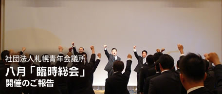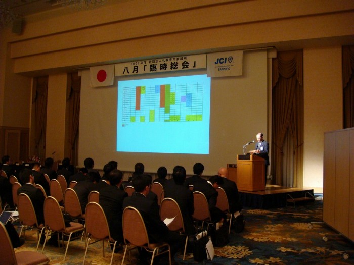 8月29日(金)札幌プリンスホテル 国際館パミールにて八月『臨時総会』が開催されました。総会は、社団法人札幌青年会議所の最高決議機関であり、すべてのメンバーが等しく一票の議決権を行使する場面であります。本総会にて2008年度中間決算を受け、補正予算案、定款変更、例会計画変更、ブルーアース基金助成団体の審議が執り行われ、すべての議案について満場一致で可決されましたことをご報告させていただきます。また、2009年度社団法人札幌青年会議所 佐々木和宏 理事長予定者が承認され次年度方針が発表されました。