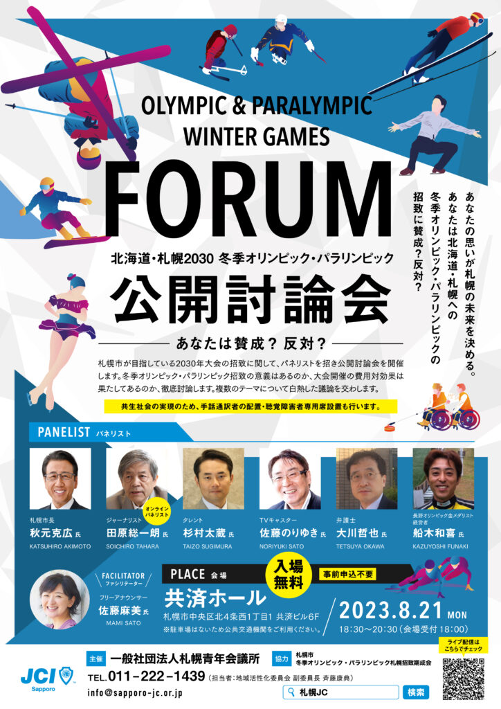 2023年8月21日(月)午後6時30分から共済ホールにて、北海道・札幌2030冬季オリンピック・パラリンピック公開討論会を開催します。事前申込不要、ライブ配信も行います。