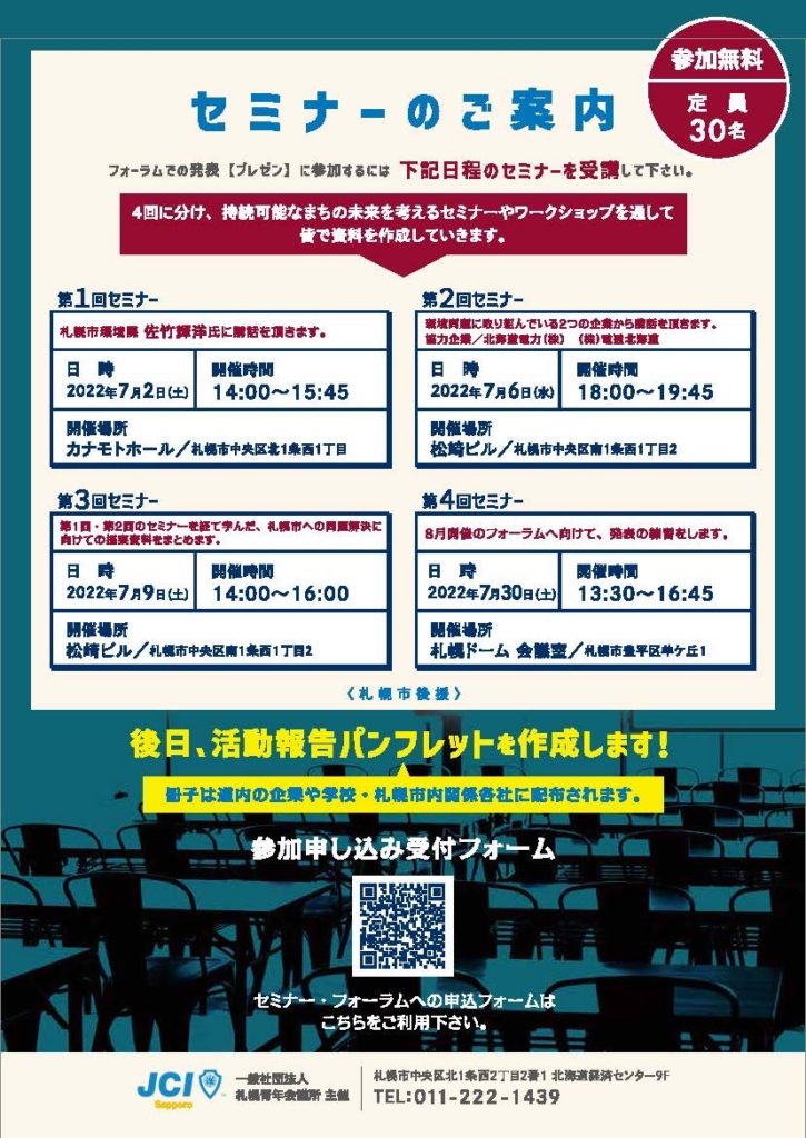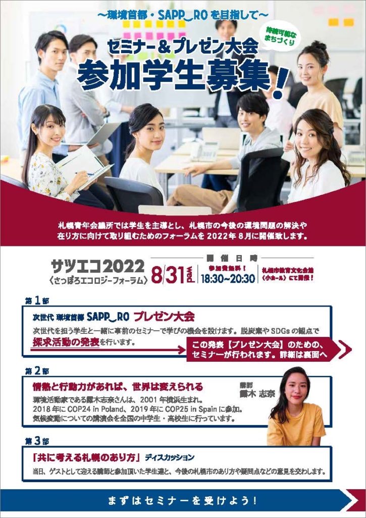 サツエコ2022(さっぽろエコロジーフォーラム)と題しまして、この札幌市の素晴らしい環境を次世代に引き継ぐために、学生を主体とし、地域課題に対して理解を深め、解決策について議論、提案するファーラムを開催致します。